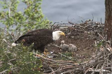 Bald eagle perching over its young eaglets in a nest high up in a tree