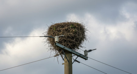Stork nest on an electric pole in front of a cloudy sky