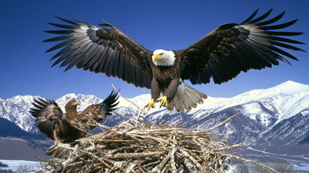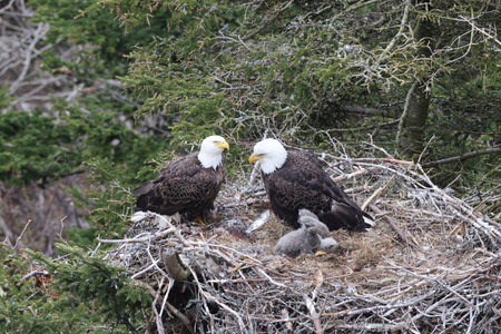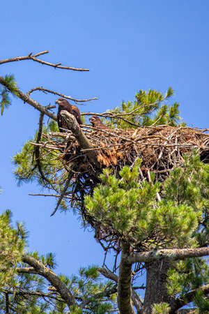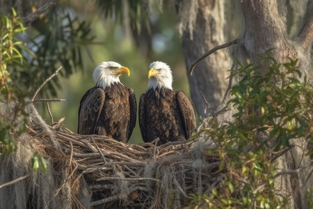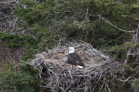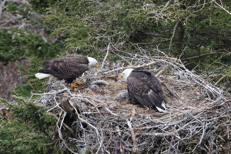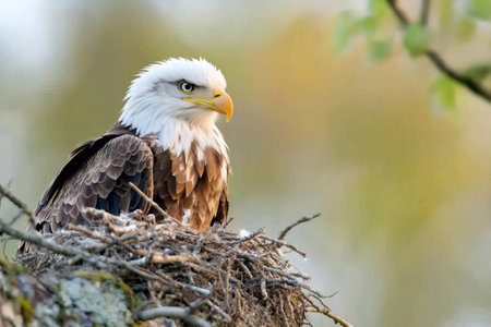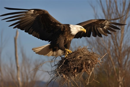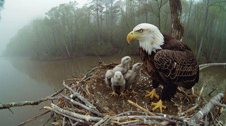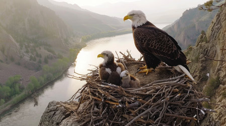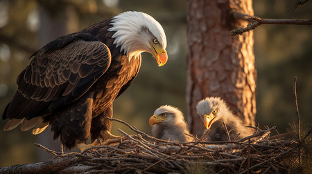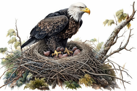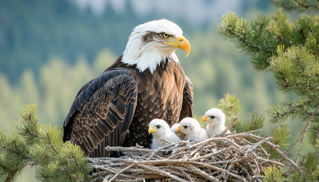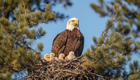 Proud bald eagle perched in its nest, guarding its young with a watchful eye