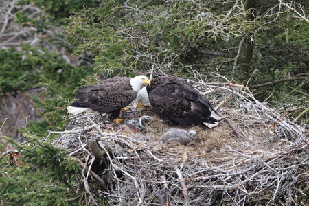 Current bald eagle parent watching over its young offspring in their nest high on a cliff, showcasing the beauty of wildlife