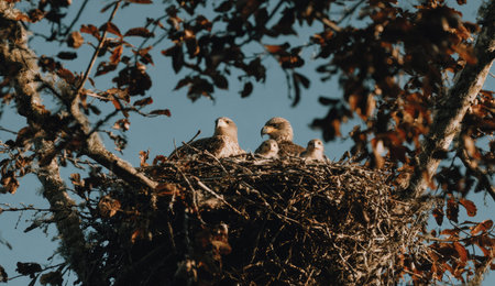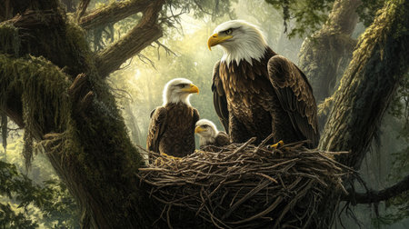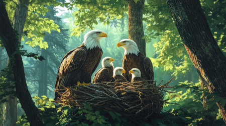 Wildlife in a Serene Forest Nest: An eagle family nestled in a forest canopy, the peaceful setting filled with the sounds of nature, capturing a moment of wildlife harmony.