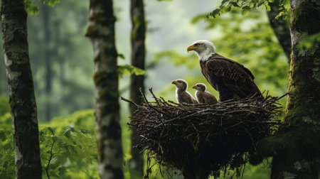 Eagle Nest in Forest Setting: A peaceful eagle family caring for their young in a forest nest, surrounded by nature's tranquility and vibrant green foliage.