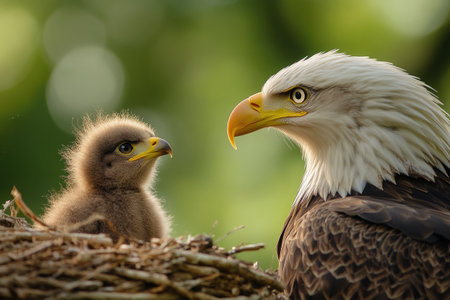 Majestic bald eagle parent shares a close moment with its adorable chick in their nest, showcasing the beauty of family bonds in the wild