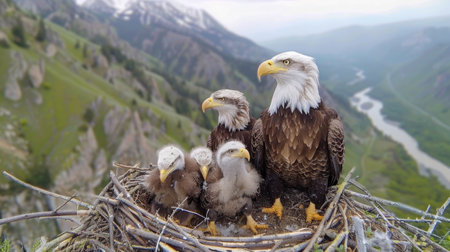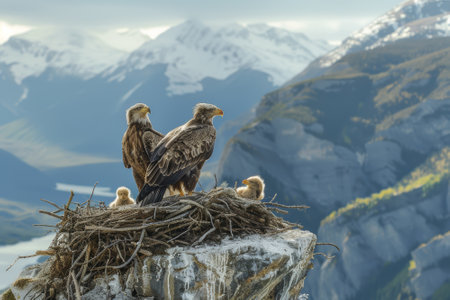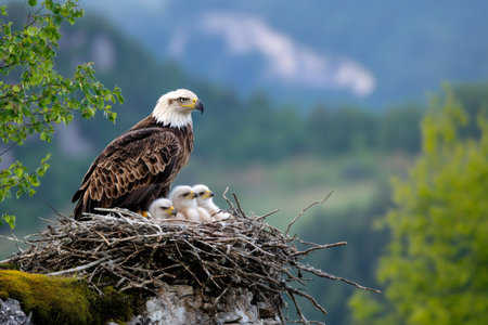 Majestic eagle perched high, watching over her fluffy chicks nestled in a sturdy nest, mountains in the backdrop, a picture of parental care.
