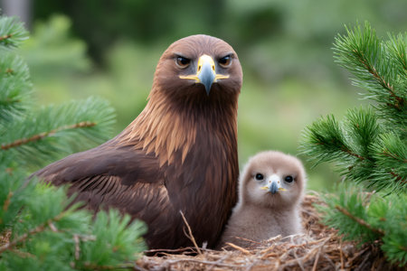 Golden eagle protecting its fluffy chick in a nest among evergreen branches