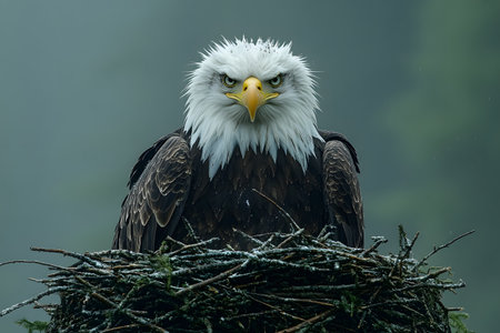 A bald eagle perches majestically on its nest, surrounded by a misty backdrop. the striking expression and detailed plumage highlight the bird's regal presence, symbolizing strength and freedom in the natural world. Generative AI