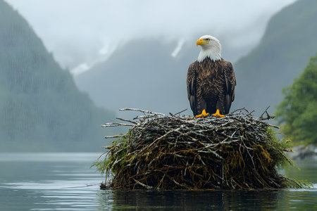 A striking bald eagle stands proudly on its nest situated on a serene lake, surrounded by misty mountains. the scene exudes tranquility and power, showcasing the beauty of nature and wildlife habitat. Generative AI