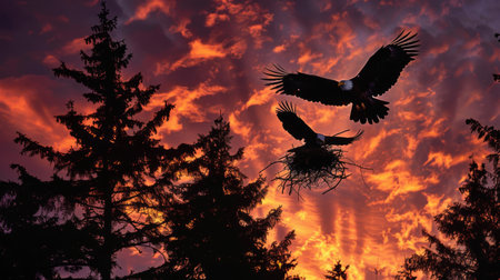 Silhouetted eagles soaring above a dense forest against a dramatic, colorful sunset sky, highlighting the beauty of nature and wildlife.