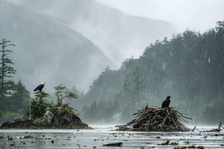 Two bald eagles perched on small forested islands in heavy rain, surrounded by misty trees and a tranquil, dramatic landscape.