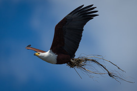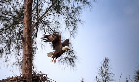 Flying Adult bald eagle Haliaeetus leucocephalus flies near his nest on Marco Island, Florida in the winter.