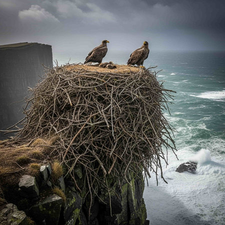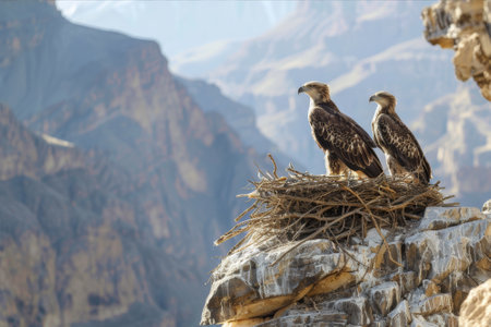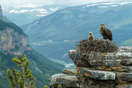 Eagles nest perched high on a rocky cliff with mountainous landscapes in the background, eaglets eagerly awaiting feeding.. AI generated.