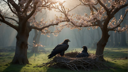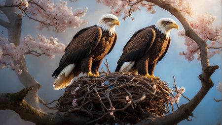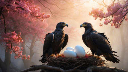Eagle family in the nest with eggs and cherry blossoms.