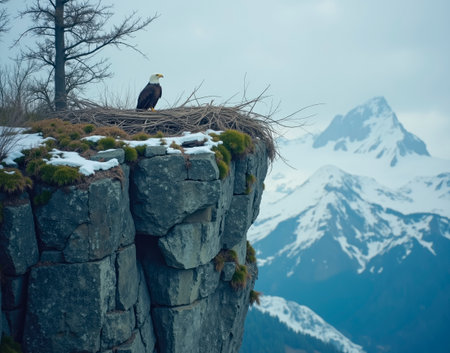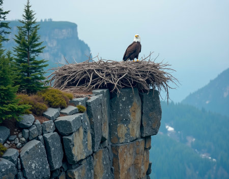 A lone eagle perched on a nearby mountain, watching its nest Creating using generative AI tools