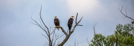 Bald Eagle (Haliaeetus leucocephalus) adult male and female, perched on branches, panorama