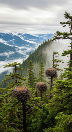 An impressive view of an Alaskan eagle nest perched on a cliff, taken from 400m with a telephoto lens, showcasing ethical wildlife photography