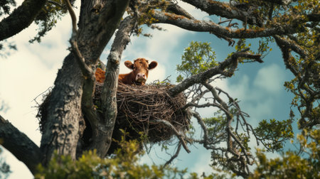An AI generated illustration of Brown cow peeks from behind a tree in its natural habitat