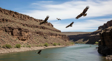 Vultures flying over the river in the mountains of Nepal.