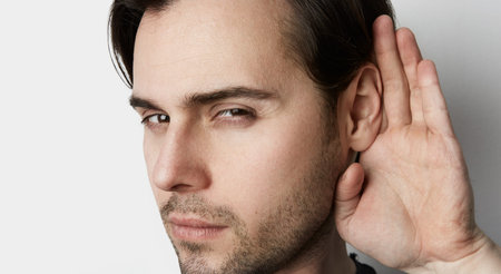 Caucasian man hold hand near ear. Trying to hear a gossip