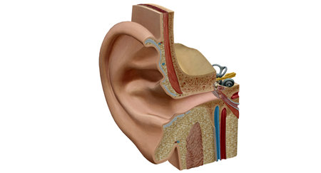 Detailed anatomical model of human ear showing internal structures and components for educational purposes