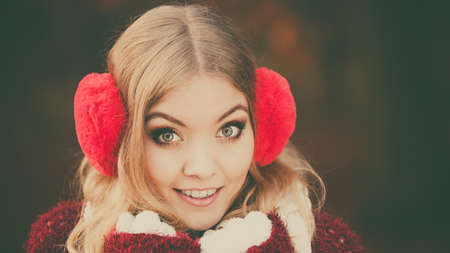 Portrait of pretty smiling fashionable woman in fall forest park. Happy gorgeous young girl in red earmuffs and sweater pullover. Autumn winter fashion.