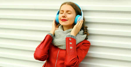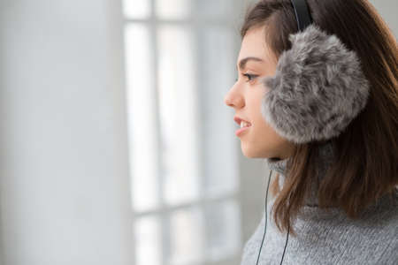 Beautiful woman in warm outerwear enjoying music on wireless headphones in cold weather