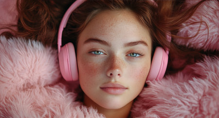 A young woman with striking freckles lies comfortably on a soft pink surface, wearing large pink headphones. She appears, relaxed enjoying her personal music experience.
