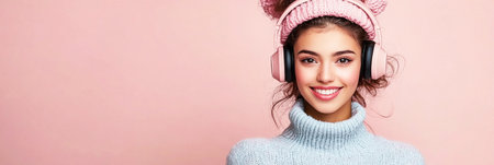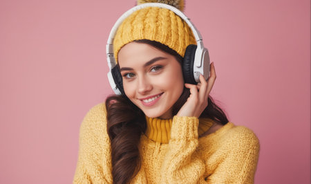 A young woman wearing a yellow knitted hat and sweater is listening to music with headphones in front of a pink background
