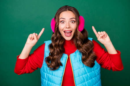 Photo of pretty cute young lady open mouth directing fingers head amazed crazy discount boutique wear pink ear warmers headband blue vest red sweater isolated green color background
