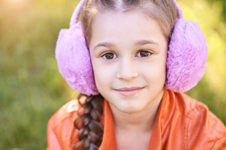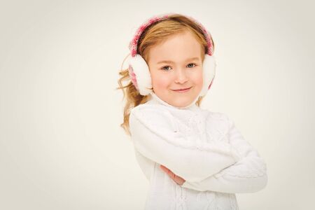 Cute little girl in winter clothes and with ear muffs on color background