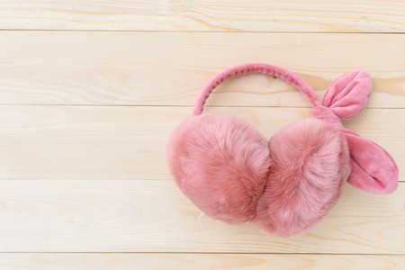 top view pink earmuffs on wooden table
