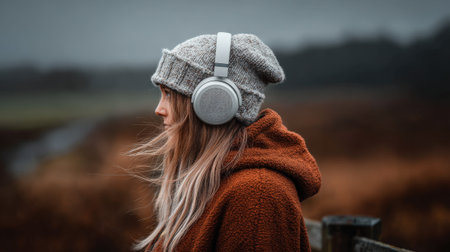 Medium shot of a person wearing noisecancelling headphones outdoors in a quiet countryside highlighting peaceful isolation from natural ambient sounds.