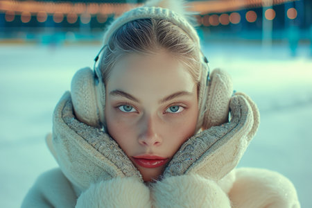 a model wearing a earmuffs and a gloves in a ice rink with a skates.