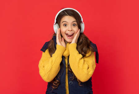 amazed child in hat listen music in headphones, technology