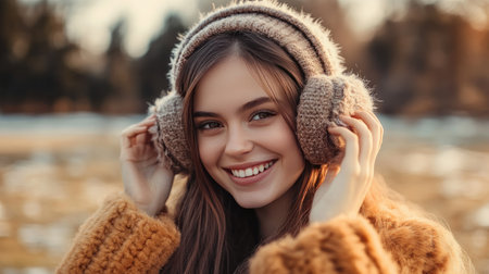 A joyful young woman wearing stylish earmuffs and a fluffy sweater enjoys a beautiful winter day outdoors, surrounded by nature's soft light and vibrant colors.