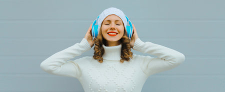 Portrait of happy inspired young woman enjoying listening to music in headphones in white hat, sweater on blue background