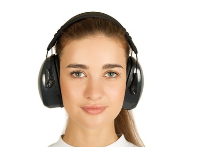 Girl at safety noise earphones on a white background