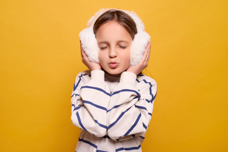 Cute little girl wearing fur headphones pouting lips in playful way sending air kiss with carefree expression and cute glamour blowing kisses with happy face isolated on yellow background
