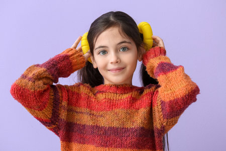 Little girl with yellow Pop Tubes on lilac background