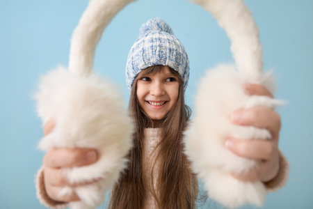 Cute little girl wearing stylish earmuffs on light blue background. Space for text