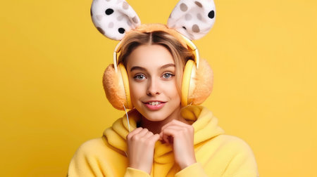 Beautiful young woman with mouse ears listening to music on yellow background