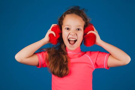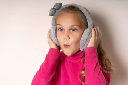 Little cute toothless girl is surprised pretending to listen to music in warm fur headphones on a light background