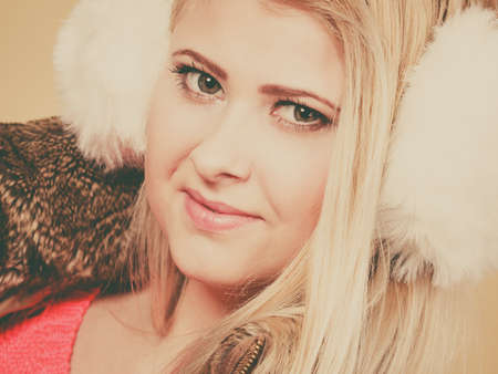 Accessories and clothes for cold days, fashion concept. Blonde woman in winter warm earmuffs and jacket.