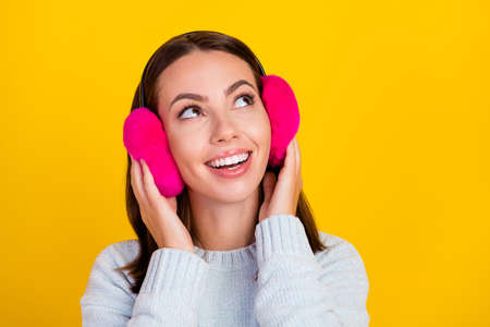 Photo of happy positive dreamy young woman wear earmuff look empty space isolated on yellow color background