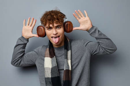 Little cute toothless girl is surprised pretending to listen to music in warm fur headphones on a light background