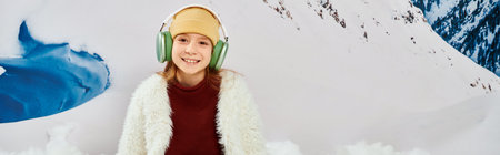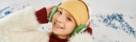 portrait of jolly preteen girl in beanie hat with headset smiling at camera, fashion concept, banner
