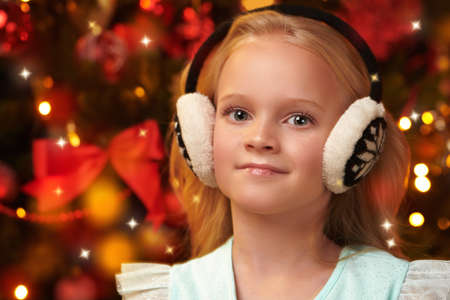 Portrait of a happy cute girl celebrating Christmas by a beautiful Christmas tree. The atmosphere of magic, lights and sparkle is around.