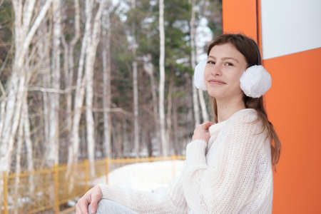 teenager girl sitting on a staicase of a forest modern house and looking at camera. girl wearing white fluffy earmuffs and casual pullover relaxing outdoors near her home. beautiful girl portrait.