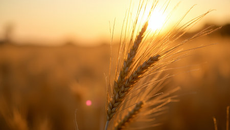 A close-up view of ripe wheat stalks in a field bathed in the warm, golden light of sunset. The sun's rays illuminate the golden-yellow and orange hues of the grain, highlighting the intricate details of the stalks and seeds. The background is softly blurred with bokeh, creating a dreamy and serene atmosphere. The emphasizes the texture and natural beauty of the wheat, conveying a sense of abundance and the peacefulness of a rural harvest.