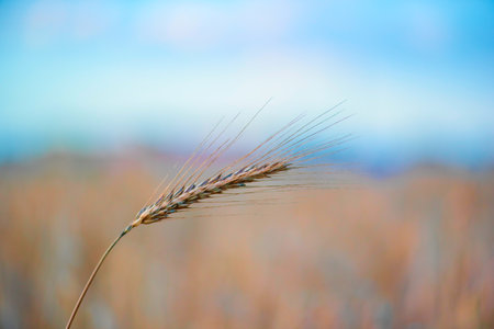 A detailed close-up shot focuses on a single golden ear of wheat swaying gently in a sunlit field. The warm, late afternoon sun casts a golden glow over the entire scene, highlighting the delicate textures of the grain and the long, wispy awns. The background is a soft blur of more wheat stalks, creating a sense of depth and abundance. evokes feelings of harvest, nature's bounty, and the tranquility of rural landscapes.