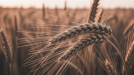 A detailed close-up captures the texture and golden hues of wheat stalks swaying gently in a field during sunset. Warm sunlight bathes the scene, highlighting the individual grains and delicate awns of the wheat ears. The shallow depth of field creates a soft, blurred background, emphasizing the natural beauty and abundance of the harvest. evokes feelings of warmth, nature, and the bounty of agriculture.